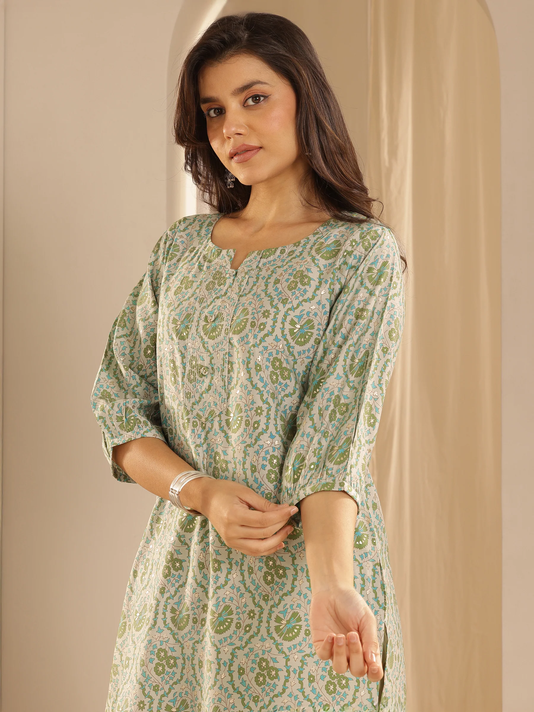 Green Printed Silk Straight Kurta